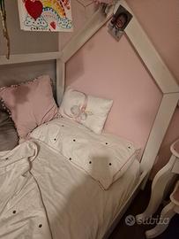 vendo letto a forma di casetta. il letto è composto da una struttura in legno bianco e la base è con doghe in legno. compreso di materasso.