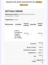 Letto a scomparsa singolo verticale in ottime condizioni completo di materasso, utilizzato per breve periodo. Molto comodo in quanto può essere chiuso completo di lenzuola, coperte e cuscini. Struttura molto solida. Colore bianco con venature. Acquistato nel 2021 a 884 euro. Si vende a 500 euro. Smontaggio e ritiro a carico dell'acquirente (Varese città).
