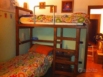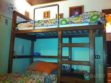 N.2 letti a ponte ad angolo, costruiti artigianalmente, struttura completamente in legno (profili 8*8) robusti e stabili, sponda letto superiore in acciaio inox, completi di n.2 reti a doghe. Qualche segno di normale usura .Vendo x ristrutturazione camera.Ritiro sul posto non spedisco. Prezzo trattabile.