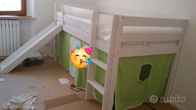 Letto a soppalco con scivolo in pino massiccio (misure nella 3^ foto) e materasso di ottima qualità usato pochissimo, praticamente nuovo.