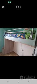 Vendo letto a soppalco di Colombini tenuto bene colore verde acqua e finitura ciliegio chiaro con rete e materasso nuovo ortopedico altezza 27 cm, a molle, con scaletta e cassetti contenitori. Misure Letto lunghezza 205, altezza 180, profondità 90, scaletta larga 35,altezza massima 100, profondità 100, con 2 cassetti apribili.
