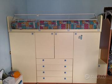 * Ampio armadio integrato con ante e cassetti spaziosi per riporre vestiti e giochi (visibile in foto).