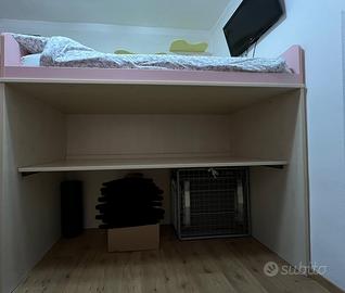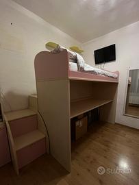Vendo letto a soppalco salvaspazio in legno chiaro con dettagli rosa, completo di scrivania estraibile e libreria abbinata.
