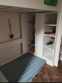 Il letto ha sotto uno spazio con un grande armadio e una libreria. Scrivania con 3 cassetti.