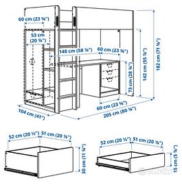 Vendo letto a Soppalco IKEA Småstad, si può montare in diverse soluzioni sia con scala a destra che a sinistra come anche l'armadio rivolto sia all'interno che all'esterno come in foto. La scrivania si può mettere sia parallelamente al letto che in perpendicolare al letto. Prezzo leggermente trattabile Ritiro e smontaggio a carico dell'acquirente