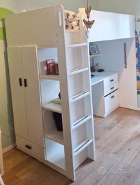Letto a soppalco, bianco bianco/con scrivania con 4 cassetti, 90x200 cm + doghe in legno + materasso. Tutto in ottime condizioni senza segni di usura. Possibilità di montare la scala a sinistra o a destra secondo le esigenze.