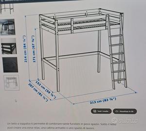 Vendo struttura per letto a soppalco colore nero, dimensioni 140x200 cm, completa di materasso sfoderabile (h 15 cm). Il letto è in ottime condizioni, solido e ben tenuto, ideale per ottimizzare gli spazi. Smontaggio e trasporto a carico dell’acquirente. Per ulteriori informazioni o foto, non esitare a contattarmi.