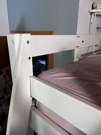 Vendo struttura per letto a soppalco una piazza e mezza (modello IKEA) in legno bianco, una soluzione ideale per chi ha bisogno di ottimizzare lo spazio in camera creando una zona living o studio sotto il piano riposo. La struttura si presenta solida e funzionale, il prezzo è stato notevolmente abbassato a causa di una modifica strutturale visibile nelle foto. La scaletta originale è stata infatti spostata dalla sua posizione nativa e fissata frontalmente per una maggiore praticità d'accesso, operazione che ha comportato il taglio e l'adattamento manuale di un pezzo di legno del telaio (vedi foto). L'annuncio si riferisce esclusivamente alla struttura in legno, mentre il materasso e gli altri complementi d'arredo visibili nelle immagini NON sono inclusi nella vendita. Il letto si trova in buone condizioni generali con i normali segni d'usura. Misure: 140x200 • Ritiro a mano a carico dell'acquirente a Zelarino, Venezia. Non si effettuano spedizioni.