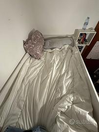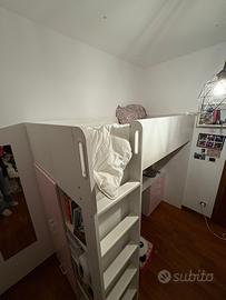 Vendo letto rialzato con scrivania sotto e piccolo armadietto. Bianco con dettagli rosa e maniglie bianche. Modello IKEA SMÅSTAD. Prezzo trattabile