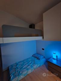 Vendo letto a ponte nuovo, acquistato 6 mesi fa. Marca Mistral Camerette, colore grigio seta e grigio platino, scaletta e ripiano contenitivi, con vani box contenitori a chiusura rallentata. Libreria e due armadi laterali, un modulo sospeso da 60 cm e una colonna da 45 entrambi con maniglia a gola. Dimensioni: 230 cm x 265 cm altezza 230. Cubotto 30*30 uso comodino per il letto superiore, e comodino due cassetti da 45 cm. Vendo causa sfratto a 1500 euro già smontato. Prezzo di acquisto 3200 euro.
