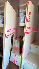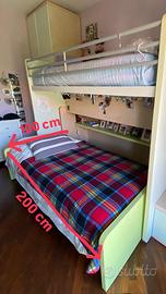 Vendiamo letti ragazza/o a soppalco scorrevole adatto anche a camere piu strette. Composto da due comodi letti singoli, scala con ampi cassettoni e corrimano ampio corridoio per rifare il letto, comodino con tre cassetti, scrivania. Materassi morfeus due. Camera già smontata, trasporto a carico dell’acquirente. Ottima qualità Usata ma ben conservata