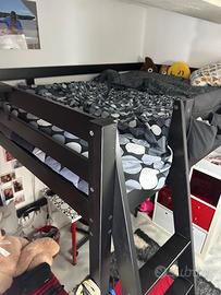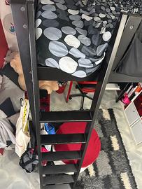 Vendo letto a soppalco di marca IKEA colore nero con scaletta, reggi tv (mensola piccola) e “comodino” (mensola più grande laterale). Tenuto in ottime condizioni ma ha qualche segno di usura