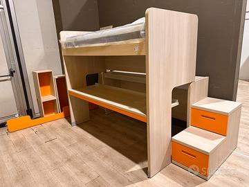 Letto a soppalco color frassino/arancione scorrevole salva spazio (materasso in vendita separatamente)