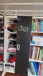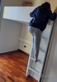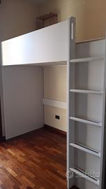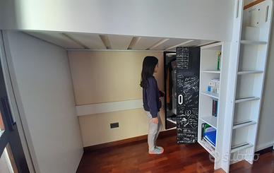 Struttura letto a soppalco ad una piazza in legno rivestito bianco satinato con armadio e libreria. ante dell'armadio rivestite in vernice lavagna. L'apertura dell'armadio può essere montata sia sotto al letto (foto) che affacciata all'esterno. Materiale robusto e irremovibile adatta a bambini vivaci. Scala con prese comode. Ottimo per la privacy in stanze condivise. Già smontato. Solo ritiro a domicilio