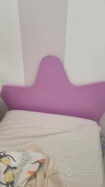 letto ad una piazza nel colore fuxia compreso di rete a doghe in legno, spalliera a forma di corona.