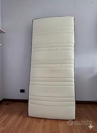 Letto a una piazza (90 x 200 cm), telaio in acciaio verniciato colore argento, con doghe in legno Sultan Lien che si adattano al letto e rappresentano la giusta base per il materasso, garantendo una perfetta distribuzione del peso. Materasso Hovag usato pochissimo, rigido e alto (24 cm), con molle insacchettate separatamente che si muovono indipendentemente l’una dall’altra, adattandosi al corpo, Provvisto di uno strato superiore extra di imbottitura morbida che migliora il comfort. Il tessuto stretch sul lato superiore del materasso segue il contorno del corpo, offrendo un comfort ottimale. È progettato per essere usato da un lato solo: non è necessario girarlo. ideale per dormire bene, con buon appoggio della schiena.