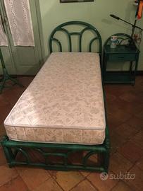 cedo,per cambio arredamento, struttura letto in bambù, ad una piazza,color verde petrolio con comodino ad un cassetto e vano portaoggetti dello stesso colore e materiale. (senza rete e materasso) in ottime condizioni.
