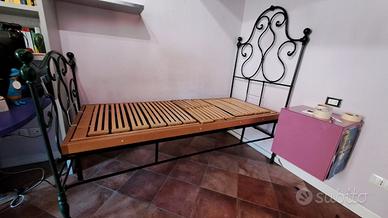 Letto singolo in ferro battuto del '900. Facile da rimontare. Molto resistente, di colore verde scuro. Manca un pezzettino di decorazione in un punto. Le doghe sono regolabili, e si possono tirare su dalla parte della schiena e/o dei piedi.