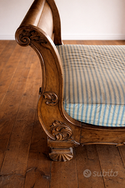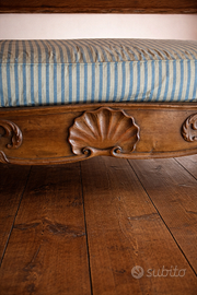 Elegante letto antico francese in legno massello, risalente alla fine dell’800 / primi del ‘900, caratterizzato da splendide lavorazioni intagliate a mano con motivi a conchiglia e volute tipiche dello stile Luigi Filippo / Luigi XV revival. Struttura molto solida e stabile, realizzata in legno massello (probabile noce), con bellissima patina originale che ne valorizza il carattere autentico. Ideale sia come letto singolo sia come divano d’arredo per ambienti rustici, case di campagna, loft o arredamenti di pregio. Il pezzo è originale d’epoca, non riproduzione. Condizioni buone considerando l’età, con normali segni del tempo che ne attestano l’autenticità.