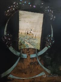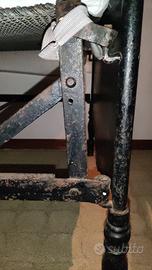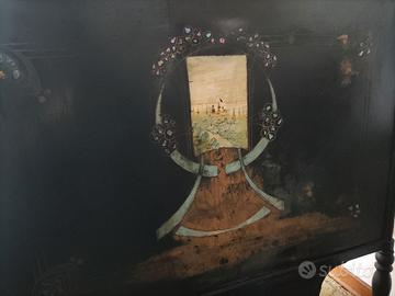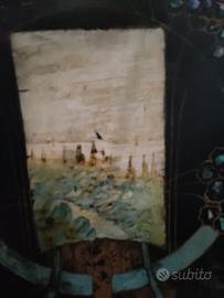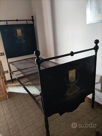 Splendido letto in ferro battuto d'epoca,per camere da letto in stile classico, chabby chic o per amanti del restauro conservativo. La pediera e la testiera presentano una raffinata pittura ad olio su metallo originale dell'epoca con un paesaggio lacustre con canneto e vele incorniciate da volute eleganti. Struttura in ferro battuto pieno, robusto e integro. Il letto è compreso di di testiera, pediera, traverse, longoni laterali e rete. Larghezza 90 cm. Sui Longoni laterali, presenza di ruggine, facilmente restaurabile.questo letto è stato usato fino ai giorni nostri.