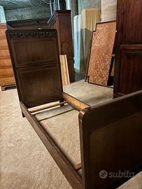 Letto singolo in legno massello Epoca presunta: Anni 1920–1940 Stile: Tardo liberty / inizio razionalista, con decorazione floreale intagliata sulla testiera Dimensioni: oLunghezza: 207 cm oLarghezza: 90 cm (standard singolo) oAltezza testata: 155 cm oAltezza pediera: 96 cm Condizioni Buono stato strutturale; Legno un po’ opacizzato Assente rete e materasso Piccoli segni d’usura e lieve scolorimento nella pediera e sulle fiancate