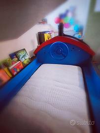 Vendo per cambio progetto letto 1 piazza a tema trenino Thomas. È unico nel suo genere in quanto è stato realizzato in falegnameria con pannelli in betulla marino, i pulsanti sulla parte di comando vicino al volante accendono: la luce di lettura sotto il tetto rgb, i 2 fari sulla parte frontale, il suono del treno... Il materasso 200x80 non è compreso mentre la rete si. Il cassetto può trasformarsi in un secondo lettino oppure restare un semplice cassetto estraibile con guide a scomparsa. Sul retro del letto c'è anche una piccola libreria.