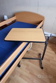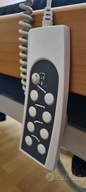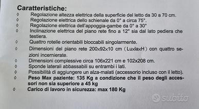 Regolazione elettrica di schienale, gambe e altezza. Telecomando per gestire tutte le funzioni. Sponde laterali di sicurezza. In dotazione anche materasso antidecubito e tavolino servipranzo ad altezza regolabile.
