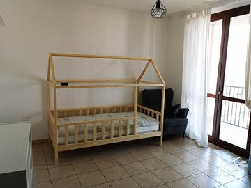 Letto in legno realizzato da un artigiano. Usato ma ben tenuto, sta benissimo nella cameretta dei bambini ma ha delle misure che vanno bene anche per un adulto. Misura del materasso (DISPONIBILE A PARTE, BEN TENUTO) è di 190 x 90cm. il letto è circa 2 metri per 1 metro.