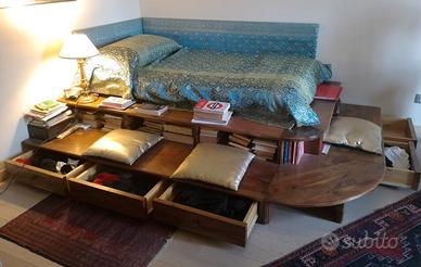 Letto realizzato su progetto originale (ideato da un architetto) e prodotto in legno massello di noce da un falegname artigiano. Il letto ha dei vani libreria intorno e 5 cassetti, inoltre sotto il materasso c'è un vano contenitore. Misure struttura 175 x 250 cm; misure materasso 100 x 185.