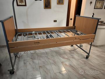 Letto motorizzato con asta e maniglia, 4 motori indipendenti per alzare schiena, gambe, e sollevare il letto parallelo al piano o inclinato dalla parte della testa, sponde da ambo i lati movibili, ruote con freni a scatto per lo spostamento. Struttura in metallo e legno.