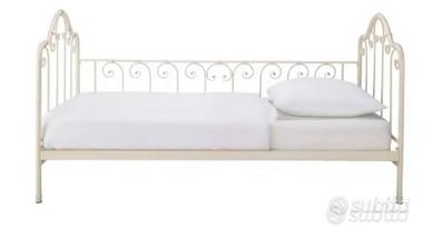 Struttura letto per letto singolo da 90 cm (1 anno di vita) comprensiva di doghe e con sponda laterale in ferro battuto, colore.avorio. Materasso NON incluso.
