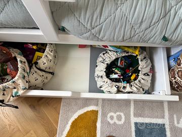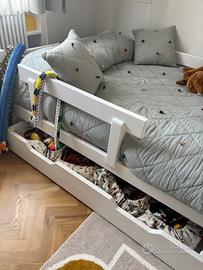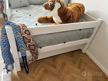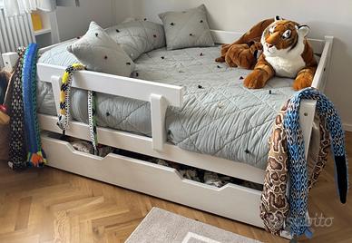 Letto per bambino 120x160 cm marca Benlemi in legno massello colore bianco con doghe in legno in perfette condizioni pari al nuovo. Viene venduto con i seguenti accessori Benlemi: barra di protezione anticaduta, cassetto estraibile con ruote e doghe in legno e pannello interno estraibile che funge sia da secondo letto che da contenitore per i giochi, due tipologie di gambe sostituibili da 20cm per utilizzo con sottoletto e da 10cm per un letto più basso in caso di bambino molto piccolo, materasso nuovo e 2 coprimaterassi anti macchia nuovi. Tutti gli accessori sono originali Benlemi in legno massello. Si vende causa mancanza di spazio per trasloco. Ritiro a vostro carico a Roma in zona Piazza Istria, non e’ possibile la spedizione. Prezzo non trattabile.