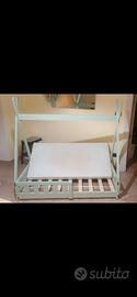 Di legno, completo di tutte le viti e Compreso il materasso. Lunghezza 1,46 Larghezza 76 Altezza 1,42