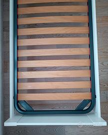 Letto singolo di colore bianco con doghe in legno (marca Dorsal) fissate direttamente alla struttura in legno del letto, quindi senza piedini a terra. Disponibile anche il materasso in regalo. Dimensioni: Larghezza 87 cm Lunghezza 200 cm Altezza testiera 70 cm.
