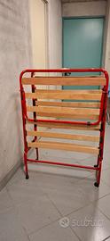 Brandina letto singolo pieghevole in metallo rosso, con doghe in legno. Misure aperto: larghezza 80, lunghezza 194 cm. ingombro da chiuso 34 x 80, altezza 112. con ruote per essere spostato agevolmente. ritiro a Bossico (BG)