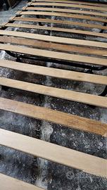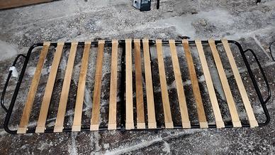 Vendo letto pieghevole singolo con struttura in metallo nero e rete a doghe in legno, completo di ruote per un facile spostamento.