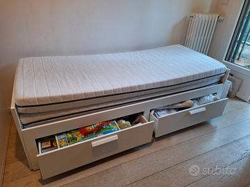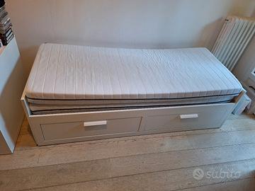 Ikea Brimnes struttura letto o divano in legno che scorre al pari e da singolo diventa matrimoniale. Base doghe in legno. Con due materassi in schiuma con fodera con cerniere e lavabile 80x200x 13 . Dotato di due cassetti. molto omodo e molto funzionale. le ruote sono state cambiate da poche settimane, sempre con originali. alcuni segni di usura in un angolo. vedi foto. ritiro a mano a Grassina, Bagno a Ripoli.