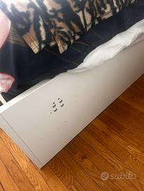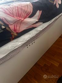 per necessita di spazio vendo letto brimnes contenitpre + testiera (chi volesse anche il materasso) comprati a gennaio. ho altre foto. purtroppo nonostante il cambio dei pezzi il pezzo del compensato (vedi ultima foto) non regge piu e la retr tende a cadere in giu. quindi sarebbe da cambiarla perche all ikea non avevano quel pezzo.