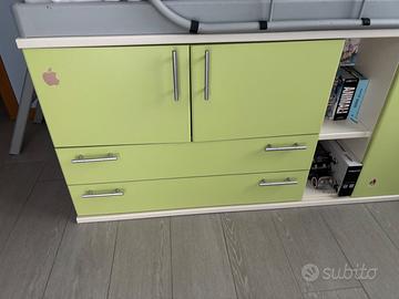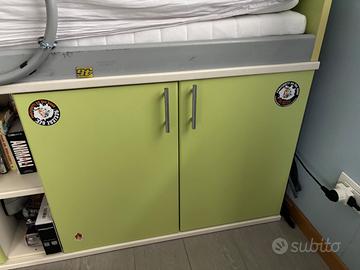 letto per camera da letto bambino/ragazzo colore bianco e verde con mobile. Il materasso (non incluso) è posizionato a un'altezza di 70 cm e sotto ci sono ante e cassetti. Dimensioni 200x90x70(altezza) cm