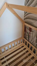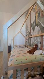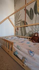 Splendido letto a casetta in legno naturale, in stile montessoriano, perfetto per arredare la cameretta e stimolare l'autonomia dei più piccoli. Il letto è in stato ottimale e pronto all'uso, si presta per diventare anche una componente di gioco. Dettagli e Misure Dimensioni: Misura standard per materasso da 190x80 cm. Versatilità: Design intelligente che permette l'uso con o senza spondina laterale protettiva, a seconda delle esigenze. Pronto all'uso: il letto viene fornito già montato e completo di doghe. Un'ottima occasione per chi cerca un letto di qualità, già assemblato e pronto per essere inserito nella nuova cameretta. Ritiro a mano a carico dell'acquirente.