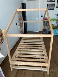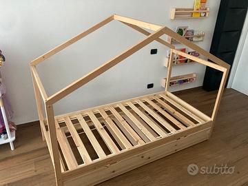 Vendo letto a casetta in legno massello di pino naturale, di dimensioni 200 cm lunghezza, 96 cm larghezza e 150 cm altezza (con casetta).