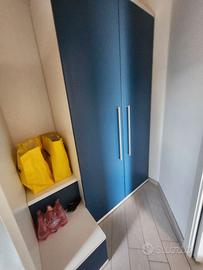 Vendo letto castello , di cui letto sotto rimuovibile, con possibilità di diventare scrivania, completo di materassi singoli e relativo armadio 120x60 colore blu.