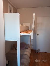 castello ditta clever con scaletta a gradini. Letto superiore con sgancio a pistone per rifarlo in modo comodo. Reti a doghe. Il letto sotto ha due cassetti molto capienti ed è su ruote frenabili x praticità nelle pulizie e può essere messo anche in posizione angolare in quanto i due letti sono indipendenti. Solo consegna sul posto.