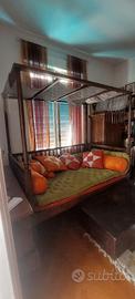 Letto coloniale a baldacchino in legno tek compreso di cuscini e materasso 170x120h220