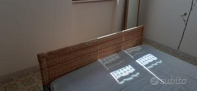 Letto con materasso e spalliera/pediera in vimini. Comodini con profilo di legno e tessuto