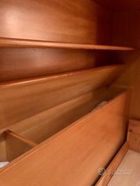 Vendo cameretta in legno massiccio composta da letto incassato in un armadio a ponte, completo di strutture laterali con mensole e cassetti chiusi. Il tutto realizzato negli anni Novanta del secolo scorso dal maestro artigiano Nicola Baldassarra di Sora (Fr), città del mobile. Sono presenti decorazioni eseguite a mano con colore pastello. Presenti numerosissimi scomparti per riporre biancheria, abiti e molto altro. Il mobile è in condizioni perfette e può essere utilizzato anche senza mensole laterali (solo letto e armadio). Il letto ovviamente può essere posizionato anche in altra zona della camera nel caso in cui si voglia posizionare un divano sotto l'armadio. Le misure sono: larghezza (letto+armadio) cm. 310; larghezza totale (con mensole a destra e a sinistra) cm. 530; profondità (senza letto) cm. 60; profondità (con letto) cm. 112; altezza cm. 230. Vero affare.