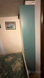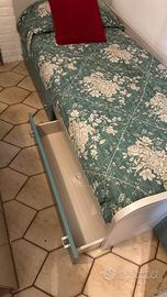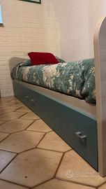 Letto singolo con struttura grigio cenere e testiera/pediera sagomate. Include due ampi cassettoni sottostanti in finitura azzurro opaco con maniglie, ideali per riporre coperte, lenzuola o giocattoli. La soluzione salvaspazio perfetta per ottimizzare lo spazio nella cameretta. Include materasso comodo e in ottime condizioni. Incluso anche un mobile stretto e alto, in coordinato, per un set completo.