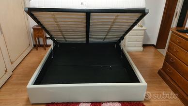 Vendo per inutilizzo letto a cassone completo di materasso 160x190. Acquistato da Mondo Convenienza nel 2020 ed utilizzato un SOLO anno. Nell' imbottitura della testata del letto nella parte sinistra la pelle è screpolata come da foto allegata. Avevamo risolto acquistando una copertura per testate letto come si vede nella foto di copertina, anche questa è compresa nel prezzo.