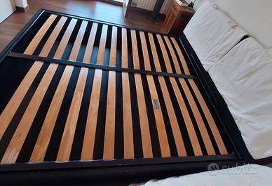 Letto matrimoniale con cassone ditta Oggioni, base doghe 160×200 cm, rivestimento rimovibile in cotone per testiera e sponde.