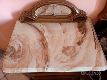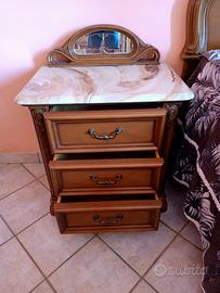 Letto con rete e materasso ( Lungh: 210 cm Largh: 180 cm) + 2 comodini (P: 42 cm L: 62 cm H: 60 cm) con piano in marmo (per chi interessato sono disponibili anche, 2 poltroncine, cassettiera con specchio e piano in marmo, armadio ed appendiabiti).